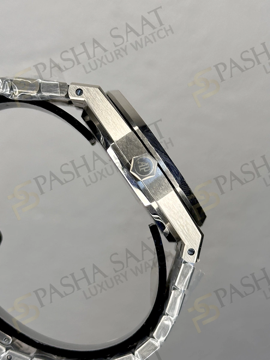 Marka: Audemars Piguet Royal Oak Otomatik Cinsiyet: Erkek Kadran Rengi: Siyah Kordon Cinsi: Çelik Kasa Çapı: 41 mm Kasa: Çelik Cam Cinsi: Safir Cam Makine Cinsi: SWISS Audemars Piguet 3120 Automatic Movement 28800bph Fonksiyonlar: Tüm Fonksiyonlar Aktif Takvim: Var Garanti: 2 Yıl Mekanizma Garantilidir