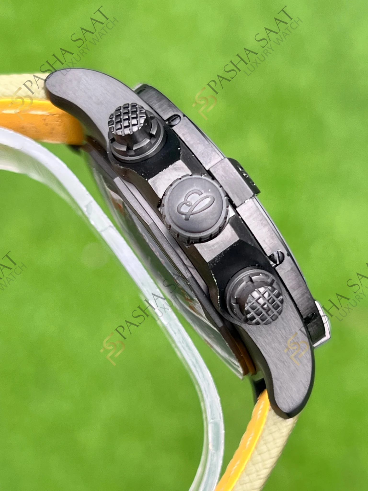 Bu çarpıcı saat, **45mm** çapında, hafif ve dayanıklı **titanyum kasaya** sahip. Siyah DLC kaplama, saate agresif ve modern bir görünüm kazandırırken, çizilmelere karşı ekstra koruma sağlıyor. Kasanın altında, otomatik kurmalı, yüksek hassasiyetli bir **kronograf mekanizma** bulunuyor. Bu mekanizma, zamanı kusursuz bir şekilde takip etmenizi sağlayan hassas bir kronometre işlevi sunuyor. Safir kristal cam, kadranı çizilmelere karşı korurken, mükemmel okunabilirlik sağlıyor. Saatin bileğinizle uyumunu sağlayan, rahat ve şık **military tarzı naylon kayış**, saate sportif bir dokunuş katıyor.