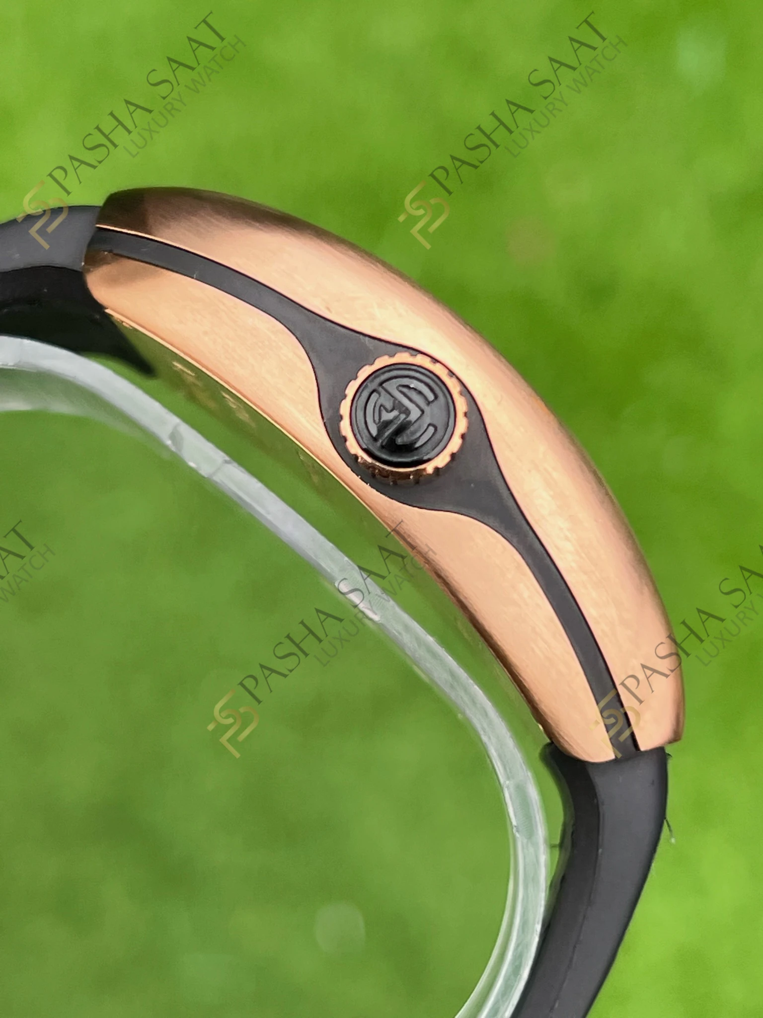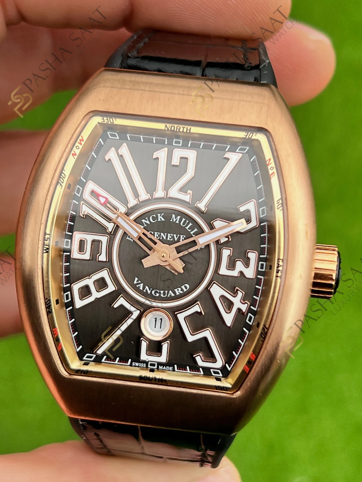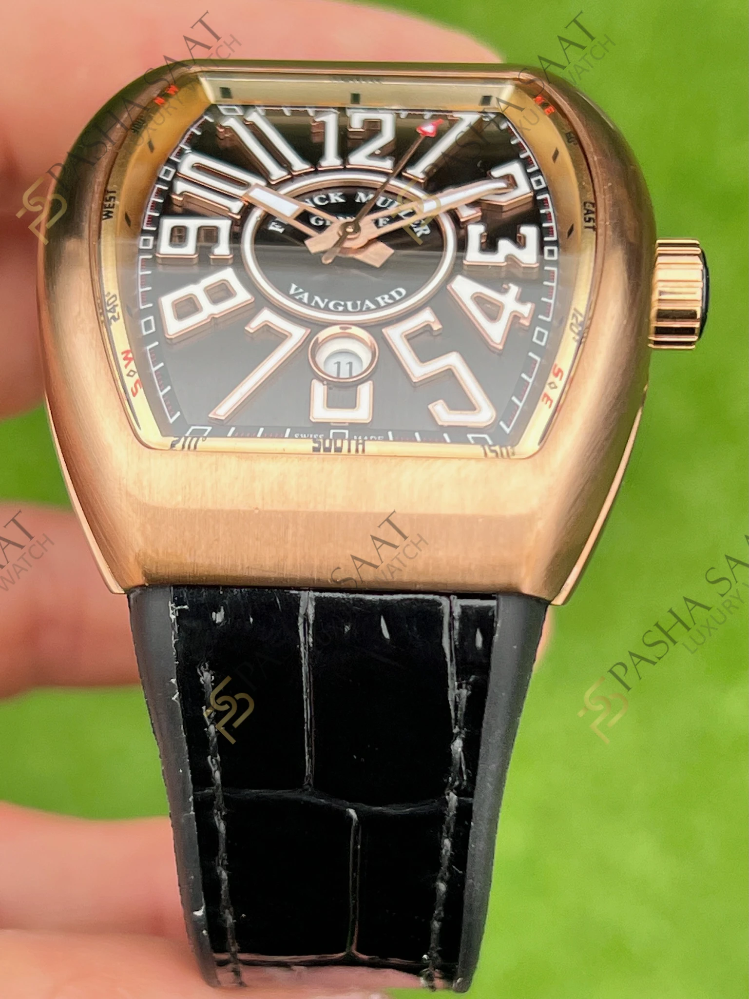 Vanguard koleksiyonunun kendine özgü kavisli tasarımı, **Franck Muller Vanguard V45 Superclone** modelinde de kendini gösterir. Kasanın aerodinamik hatları ve kadrandaki büyük boyutlu rakamlar, saate sportif ve dinamik bir görünüm kazandırır. Gri kadran, gül altın kaplama kasa ile mükemmel bir kontrast oluşturarak, saatin göz alıcı bir aksesuar olmasını sağlar.
