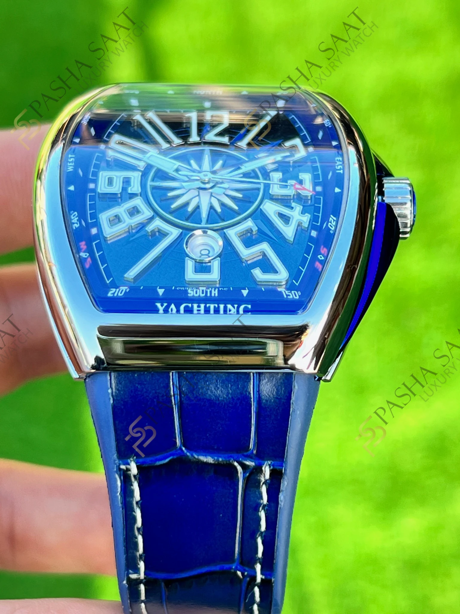 Franck Muller Vanguard Yachting’in kadranı, mavi tonları ve kontrast renkli rakamlarıyla okunaklılığı ön planda tutuyor. İbreler, karanlıkta parlayan özel bir madde ile kaplanmış, böylece her koşulda zamanı kolayca görebilirsiniz. Saat, sadece zamanı göstermekle kalmıyor, aynı zamanda bileğinizde bir stil ifadesi yaratıyor.