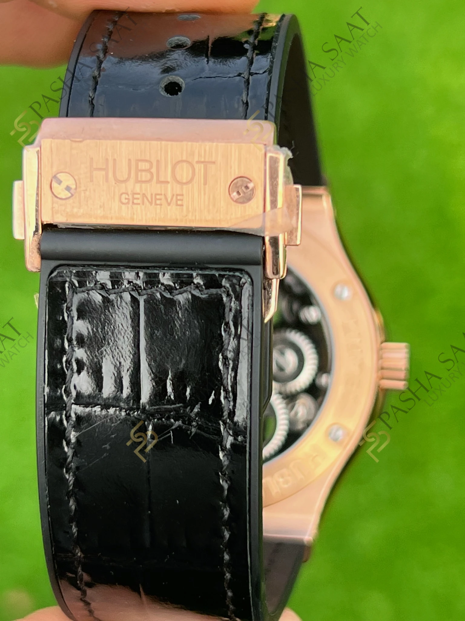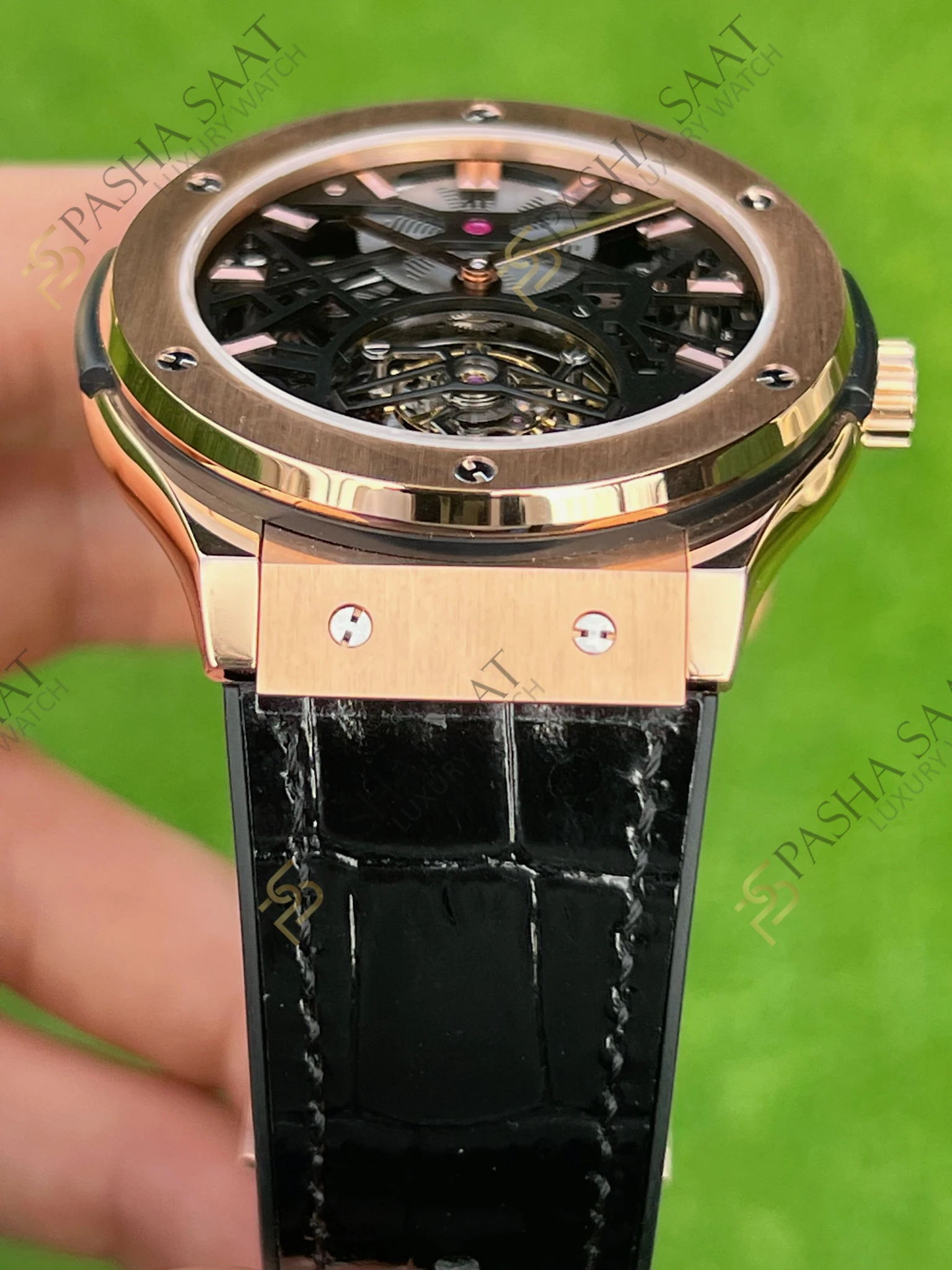 Bu **Hublot saat**, 45mm çapında rose gold kaplama paslanmaz çelik kasaya sahiptir. Rose gold’un sıcak tonları, saatin lüks ve sofistike görünümünü vurgular. Kasa, çizilmeye dayanıklı safir kristal cam ile korunur, böylece saatin muhteşem iç mekanizmasına her zaman net bir şekilde bakabilirsiniz. İskelet kadran tasarımı, saatin mekanizmasının karmaşıklığını ve hassasiyetini gözler önüne serer. Tourbillon mekanizması, yerçekiminin etkisini dengeleyerek saatin doğruluğunu artırır ve aynı zamanda hipnotize edici bir görsel şölen sunar.